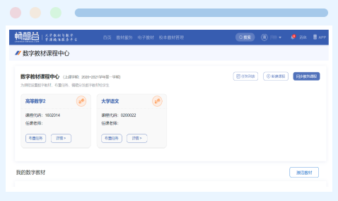認(rèn)證通過(guò)后,返回首頁(yè),點(diǎn)擊“數(shù)字教材課程”進(jìn)入課程中心。教師可以通過(guò)同步教務(wù)課程或者自建課程的形式建立自己的課程,以課程為入口,管理上課班級(jí) 信息,瀏覽課程配套資源信息,分發(fā)數(shù)字教材給學(xué)生,查看學(xué)生學(xué)習(xí)情況分析等。